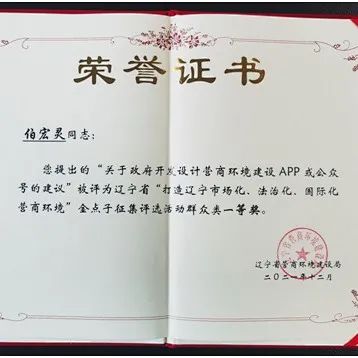 2022年1月19日获悉,由辽宁省营商环境建设局组织开展的“打造辽宁市场化、法治化、国际化营商环境”金点子征集评选活动已落幕,我会执行会长兼秘书长伯宏灵提出的“关于政府开发设计营商环境建设APP或公众号的建议”荣获社会群众类金点子一等奖。